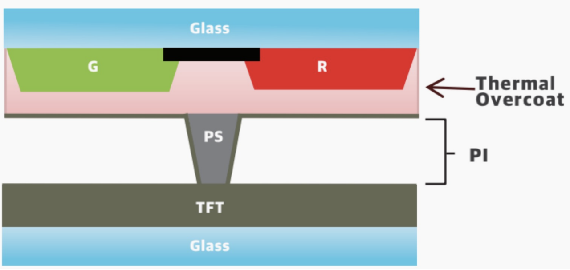 TOC应用于 IPS-like 面板,在彩色光阻 RGB 和黑色矩阵光阻 BM上形成一填平性优异的透明平坦层,同时提高后制程感光间隙材料 PS 的涂布稳定性。