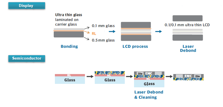 适用于超薄玻璃或硅晶片与玻璃载具的暂时接著制程。激光制程中所搭配的特殊剥离涂层(RL)材料,可将制程后的超薄玻璃或硅晶片,轻易地从玻璃载具上分离, 留下洁淨的表面。此激光剥离涂层的耐热性好,可承受制程温度高于300°C,同时能搭配各种贴合胶材、光阻或金属介面,是新一代半导体元件暂时接着/去接着制程的解决方案。